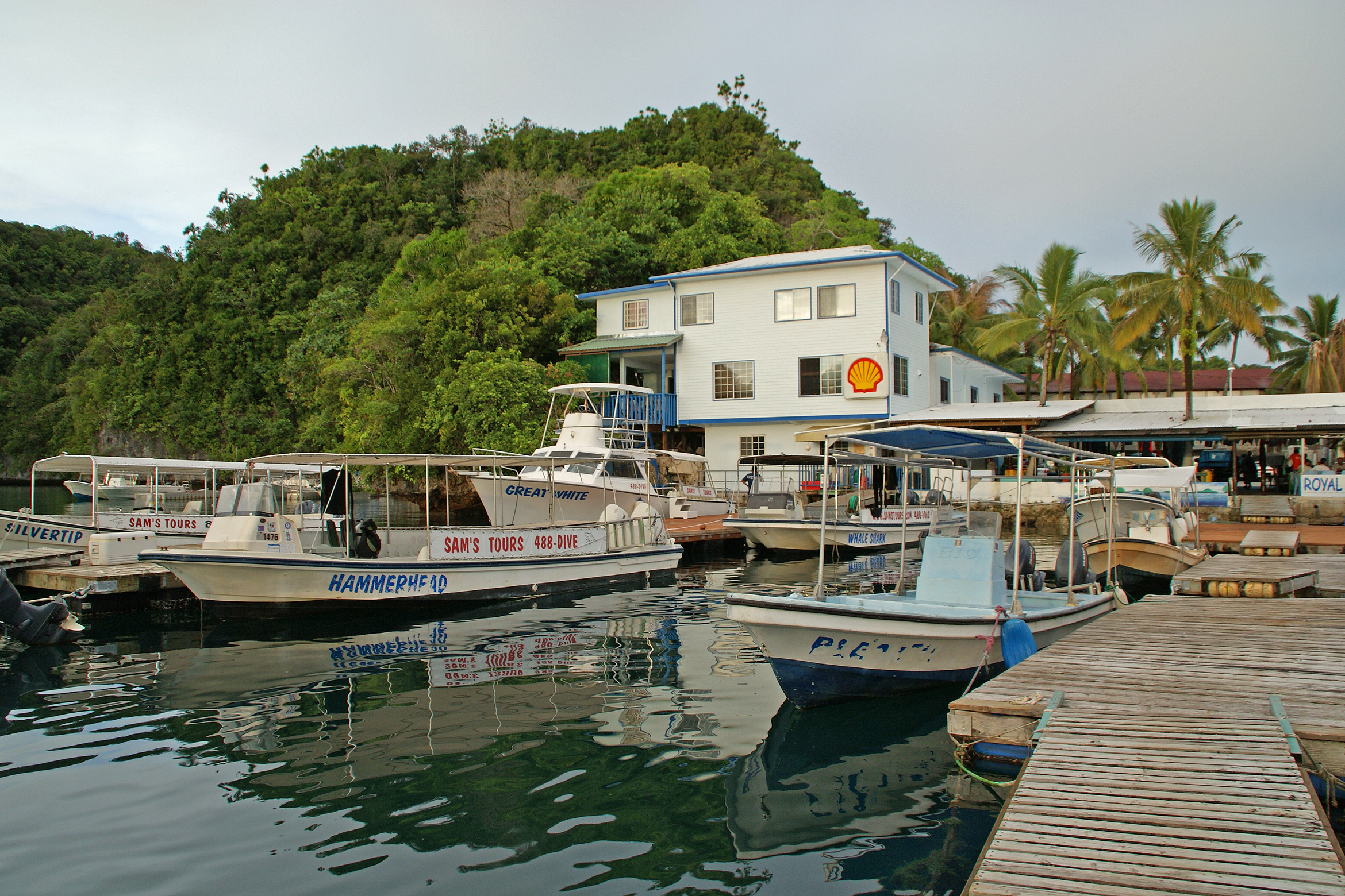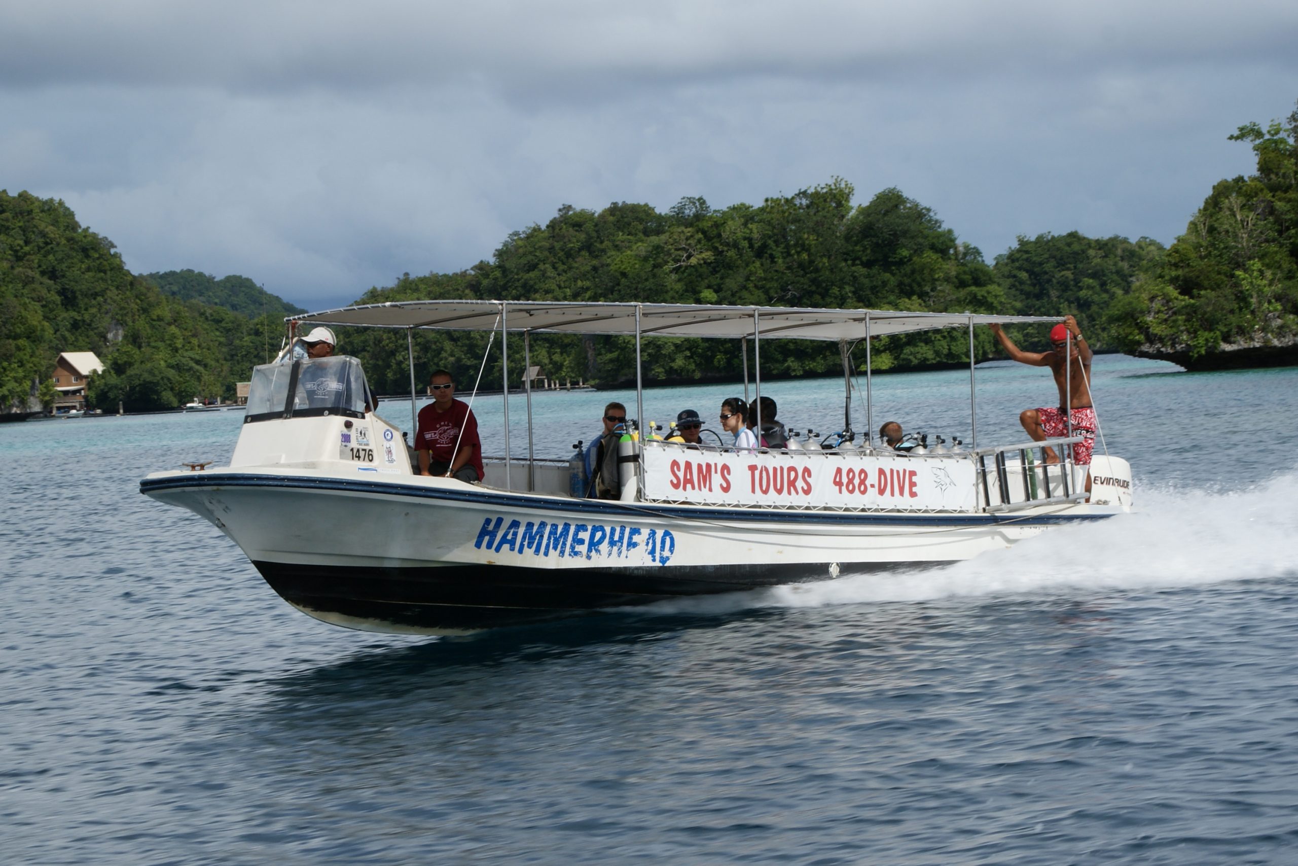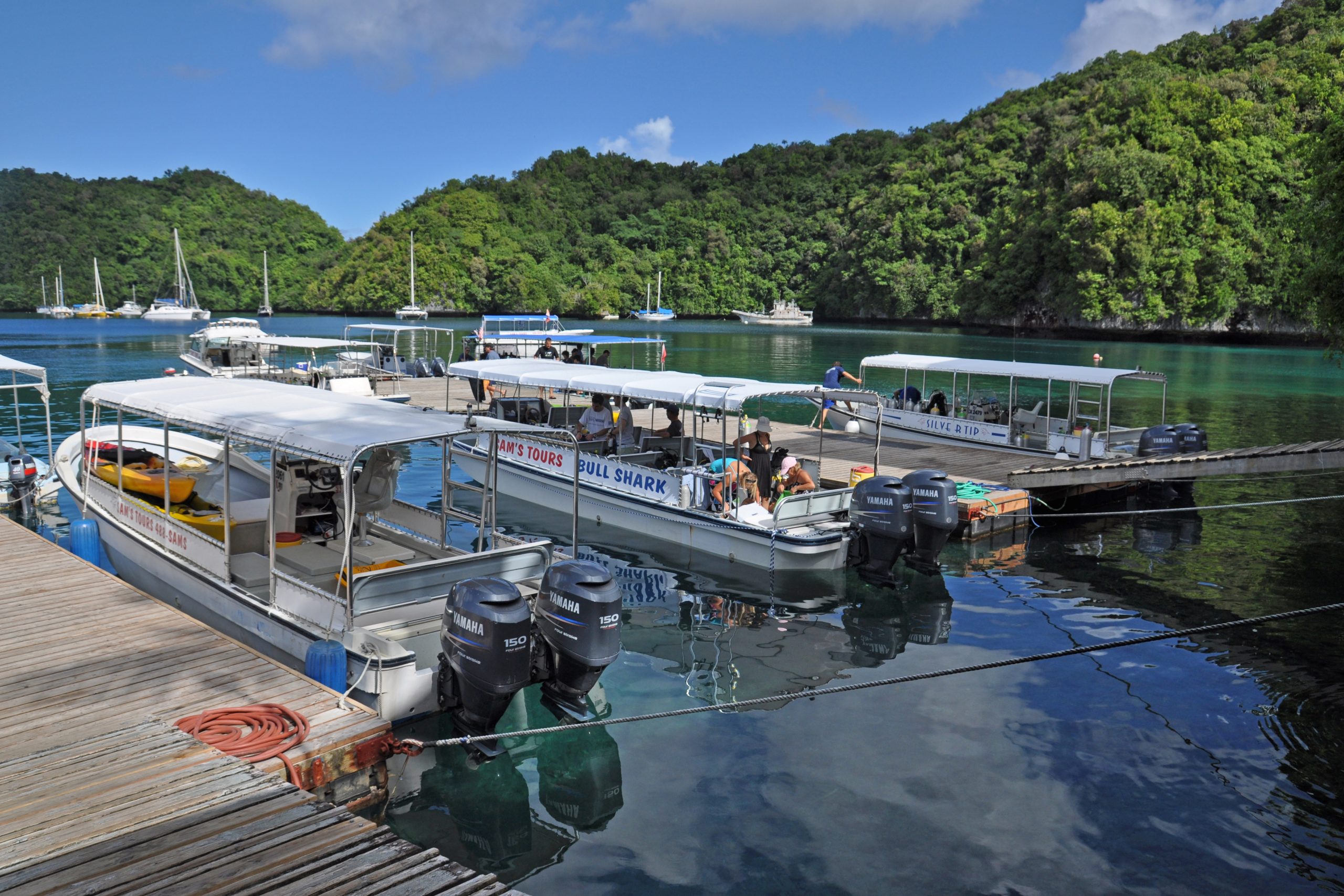 Täglich werden zwei bis drei Tauchgänge an den weiter südlich liegenden Tauchplätzen, die in etwa 50 Minuten erreicht werden, angeboten. Die Fahrt mit den Tauchbooten geht durch die herrlich anzuschauenden Rock-Islands. Dort erwarten die Taucher atemberaubende Tauchplätze wie Blue Corner, German Channel, Chandelier Cave und viele andere. Getaucht wird in kleinen Gruppen von maximal acht Tauchern pro Guide. Die Zeit zwischen den Tauchgängen wird häufig auf kleinen Inseln an einsamen Stränden verbracht. Auf der Rückfahrt nach Koror werden häufig Schnorchel-Stopps, unter anderem am berühmten Jellyfish-Lake eingelegt. Die Tauchboote kehren in der Regel gegen 16 Uhr in den Hafen der Tauchbasis zurück. Anschließend erfolgt der Shuttle zu den Hotels oder man verweilt noch bis zum Sundowner in der Bar neben der Basis.